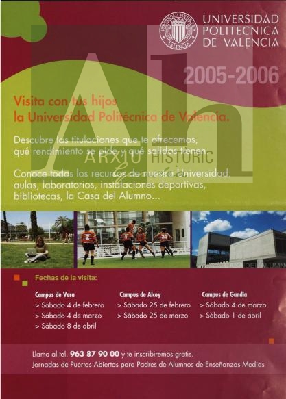 Descripció: Cartell anunciador de la visita a la UPV per alumnes d'ensenyaments mitjans als campus d'Alcoi, Gandia i València.