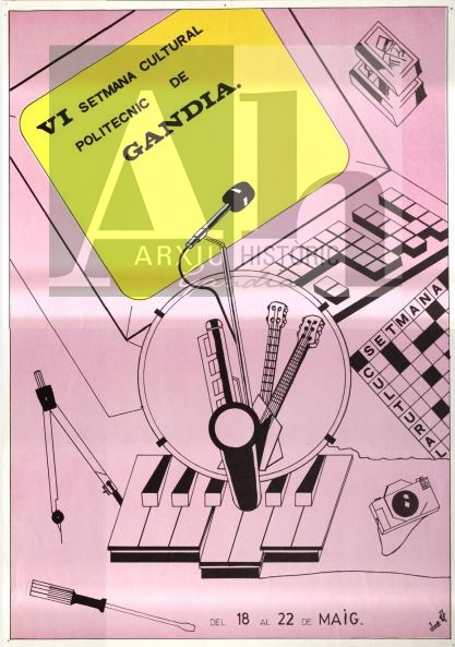 Descripció: Cartell anunciador de la Setmana Cultural del Politècnic de Gandia l'any 1987.