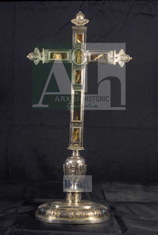 Títol: Creu-reliquiari Observacions: Creu-reliquiari d'argent amb expositors de relíquies en el fuste i els braços. Paraules clau: ART; CREUS; RELIGIONS Llocs: Convent de Santa Clara