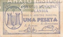Descripció: Bitllet d'una pesseta emés pel Consell Municipal de Gandia en 1937.