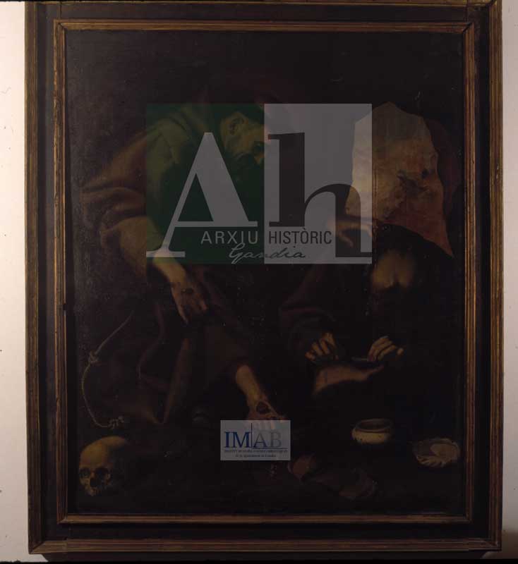 Observacions: Sant Francesc, en el seu retir penintencial és asistit pel seu company que li li cura les llagues dels peus. L'escena sembla dins d'una cova i al fons una obertura per on es pot veure el paisatge exterior.