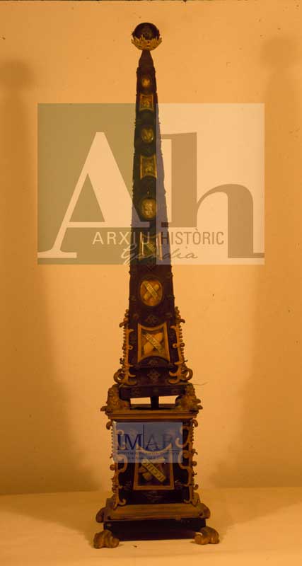 Observacions: Reliquiari en forma de piràmide i damunt una peana. En els costats de la piràmide i de la peana estàn incrustades les relíquies. Presenta zones amb decoracions de bronze en forma de cantoneres. Descansa sobre quatre garres. Forma part d'una parella.
