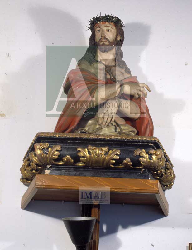 Observacions: Imatge en bust de l'Ecce-Homo damunt una peana hexagonal amb decoració de fulles d'acant. Fa parella amb la Dolorosa que està en la planta baixa