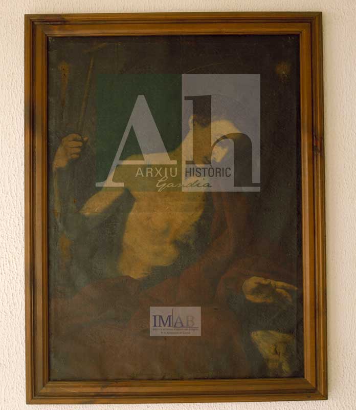 Observacions: Sant Joan Baptista amb pell de corder i mant vermell que li cobreix tan sols una part del cos. De mig cos, porta la creu amb la má dreta i amb l'esquerra es disposa a acaronar el cap d'un corderet que asoma pel angle inferior dret de la pintura.