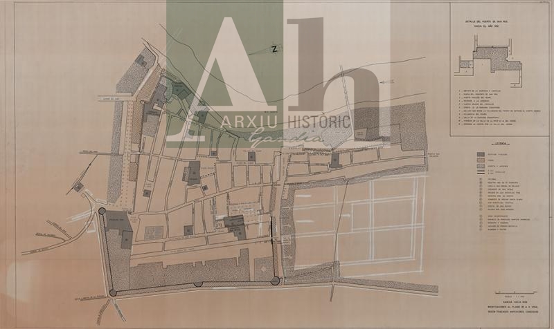 Abast i contingut: Traçat per Casimir Escrivà sota la direcció tècnica de Ferran Mut, Albert Vàzquez i Jesús Alonso. Formava part d'un projecte per al CEIC Alfons el Vell anomenat "Gandia al segle XIX. De la desintegració del ducat a la construcció de la ciutat contemporània" (1992). Es tracta de 4 plànols de treball. Un és el plànol de base d'Antonio Vicente Vidal en tamany A4; un altre és el plànol de base amb modificacions fetes a mà per Jesús Alonso; els altres dos contenen les modificacions consolidades però la diferència és el suport: un està dibuixat sobre paper blanc i l'altre sobre paper vegetal traslúcid.