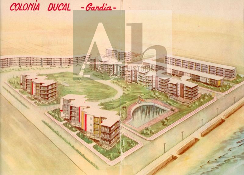 Descripció: Dibuix del projecte de la Colònia Ducal publicat al llibre de Fira i Festes de Gandia de 1961 (BB-0170).