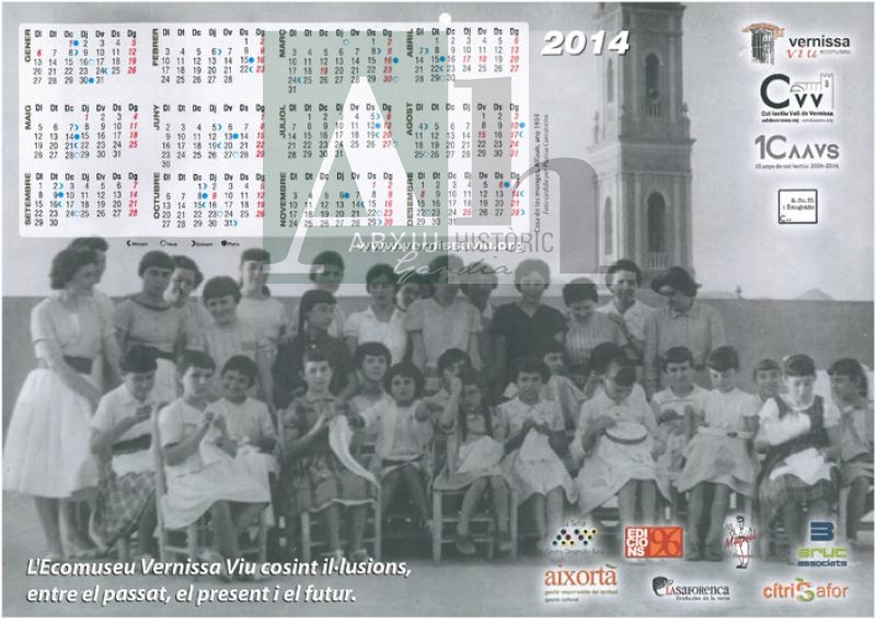 Descripció: Calendari de paret per a l'any 2014 que reprodueix la fotografia "Casa de les monges (Alfauir), 1959" cedida per Pepica Camarena