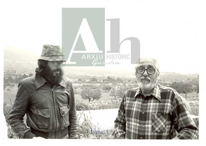 Gonçal Castelló al camp amb un home, probablement Antoni Miró