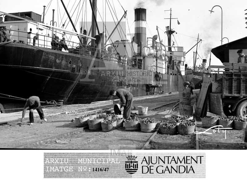 Observacions: S'observa el moll i homes carregant taronges. Olim 44897