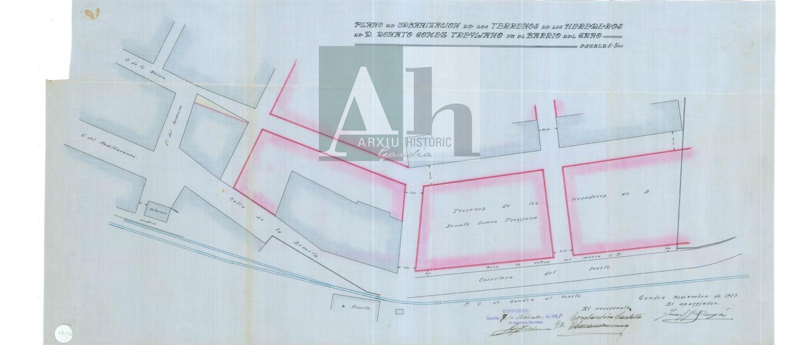 Títol: Plànol d'urbanització dels terrenys propietat dels hereus de Donato Gómez Trevijano en el Grau