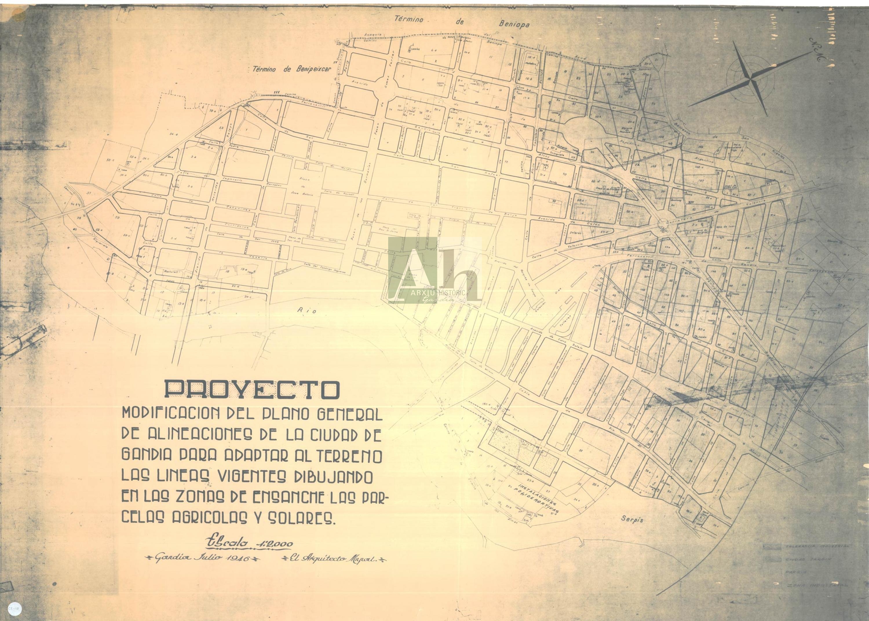 Abast i contingut: Títol formal: 'Modificación del plano general de alineaciones de la ciudad de Gandía para adaptar al terreno las líneas vigentes dibujando en las zonas de ensanche las parcelas agrícolas y solares'.