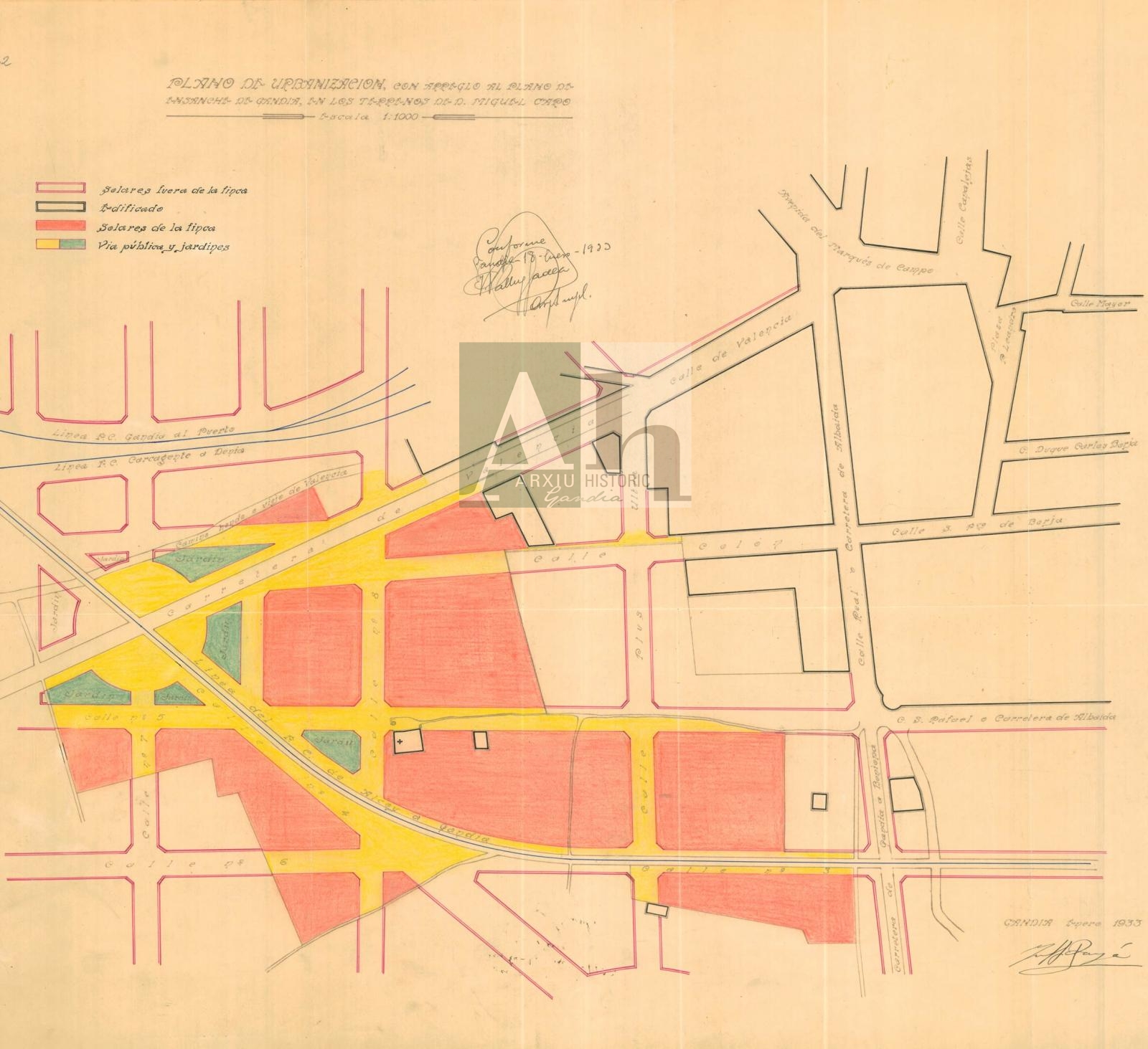 Títol: Plànol d'urbanització, d'acord al pla d'eixample de Gandia, en els terrenys Miguel Caro.