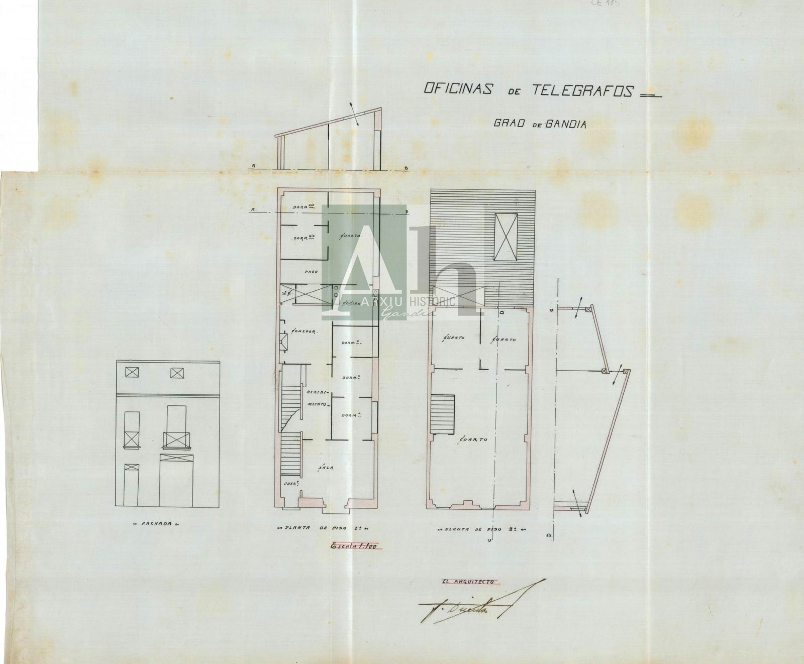 Títol: Plànol de les oficines de telègraf del Grau. Façana. Planta del primer pis. Planta del segon pis.
