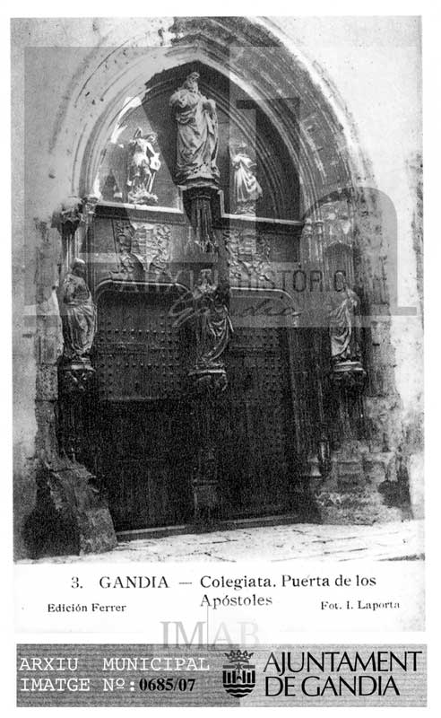 Títol: Tarja postal de la Porta dels Apòstols de la Col·legiata