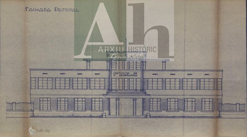 Títol: Projecte d'Institut de Segon Ensenyament. Institut Ausiàs March. Façana principal.