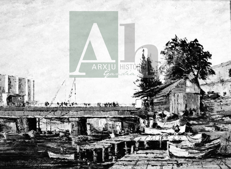 Observacions: Es tracta de la fotografia d'una pintura de Luciano Recio Bajón. Representa el pont de la desembocadura del barranc de Sant Nicolau des de la baixada sud del riu. A l'esquerra hi ha part de l'església del Grau i a la dreta, l'antic "xiringuito". És el núm. 40 de l'inventari d'obres d'art de l'Ajuntament (pintura).