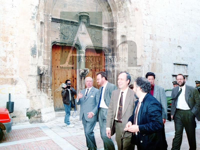 Tķtol: Eugeni Burriel, conseller d'Obres Públiques, passant per davant la porta de la Seu