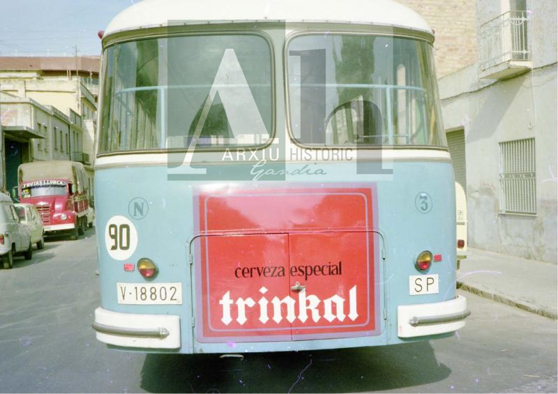 Títol: Autobús amb publicitat de la marca de cervesa "Trinkal"